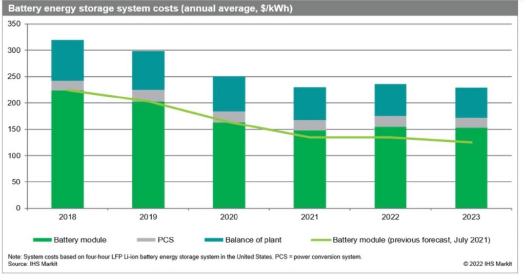 V nedávné bílé knize IHS Markit předpověděla, že prudce rostoucí ceny surovin pozastaví další pokles cen baterií pro elektromobily až do roku 2024. Tato analýza předpověděla, že průměrné ceny baterií pro elektromobily v roce 2022 budou o 5 % vyšší než v roce 2021, a to především kvůli zvýšeným auto- průmyslová poptávka po lithium-železo fosfátových (LFP) bateriích.